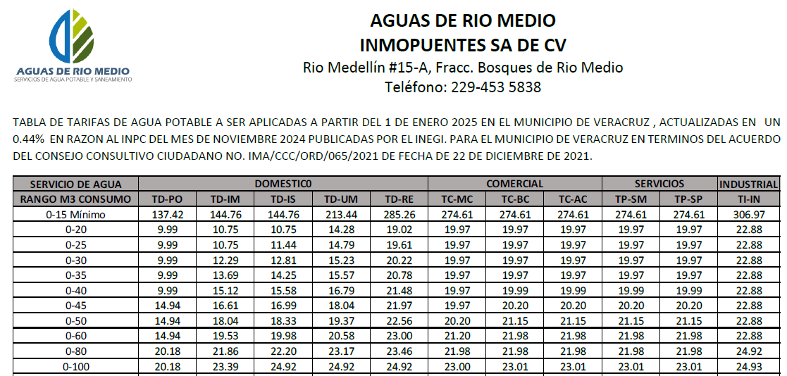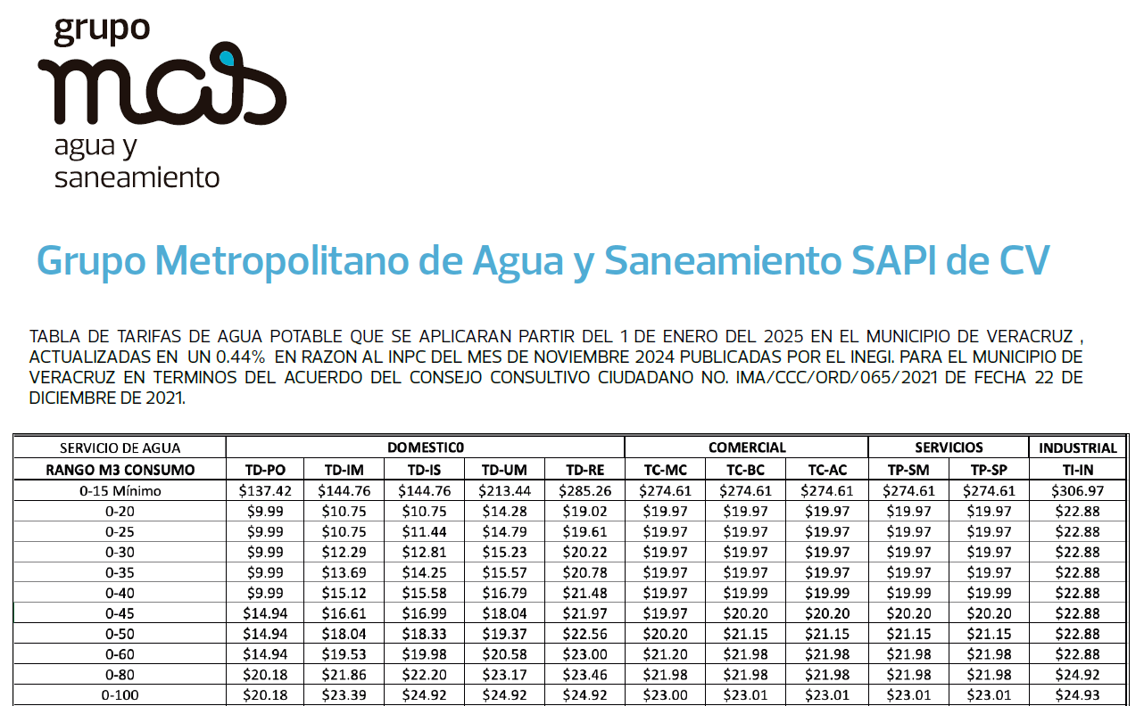 *Tarifas Vigentes de los Concesionarios del Servicio de Agua Potable y Saneamiento en el Municipio de Veracruz, Ver.